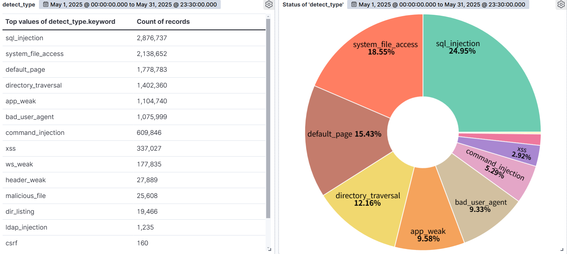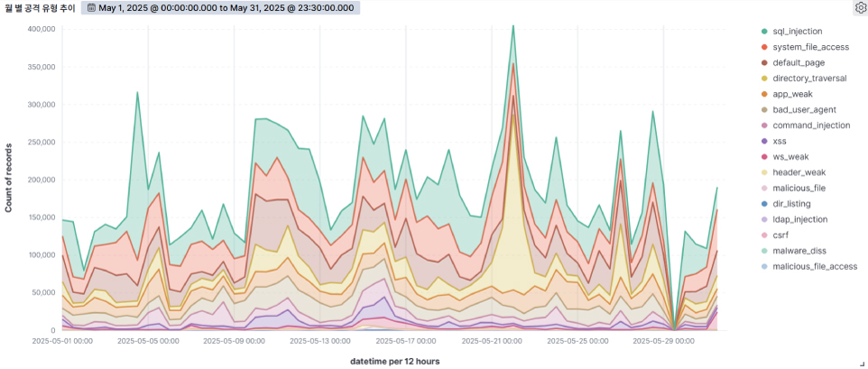 Analyzing AIWAF detected data for the month of May 2025, we detected an average of approximately 380,000+ web attacks per day, which is a significant increase from the previous month and indicates that the threats to web servers continue to escalate. We also observed a higher frequency of attacks on weekends (Saturday and Sunday) than on weekdays, which could indicate a strategic approach to take advantage of lower web server utilization during non-business hours.