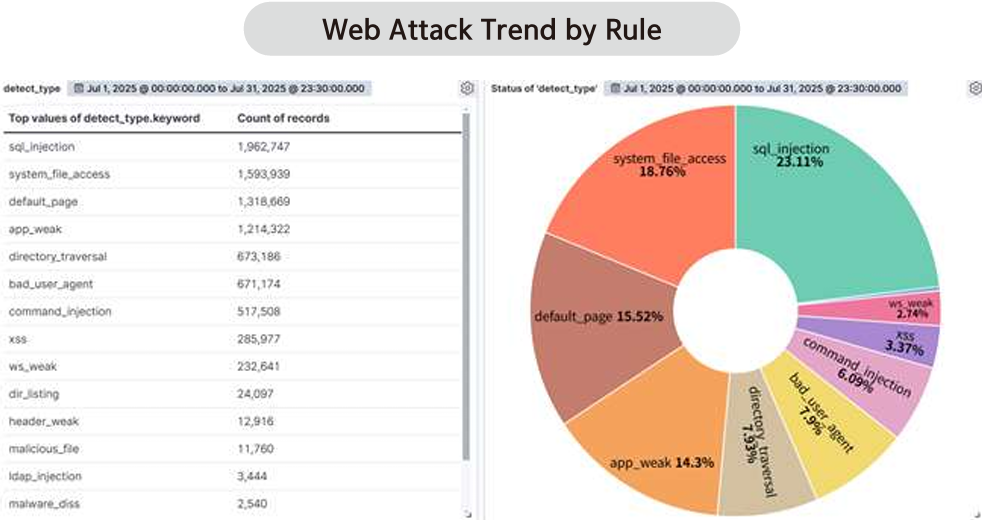 By analyzing web attack trends by attack type based on detection logs, it is possible to systematically identify which types of attacks occurred most frequently during the month.