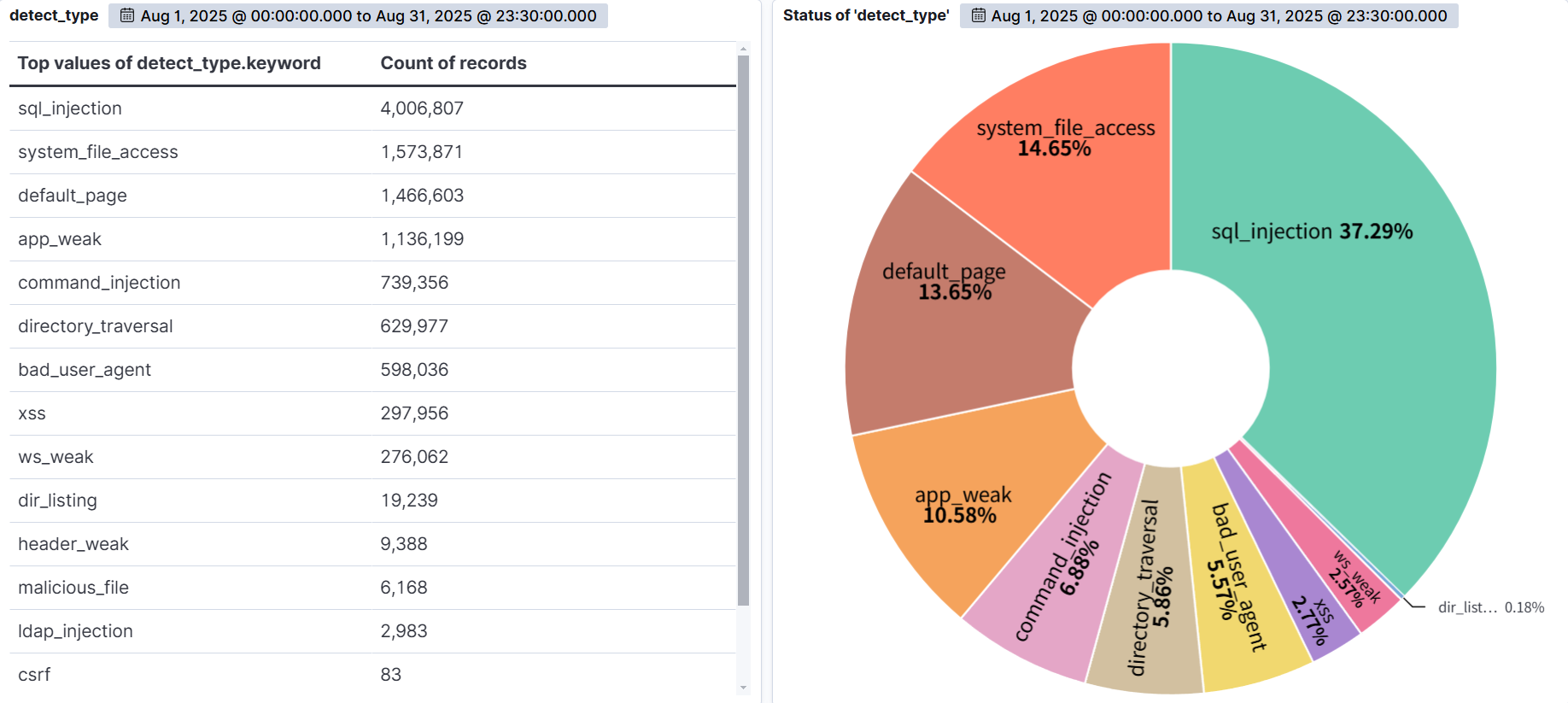 According to the statistics of web attack types detected by AIWAF during August 2025, SQL Injection accounted for 37.29% of total detections, the highest proportion.