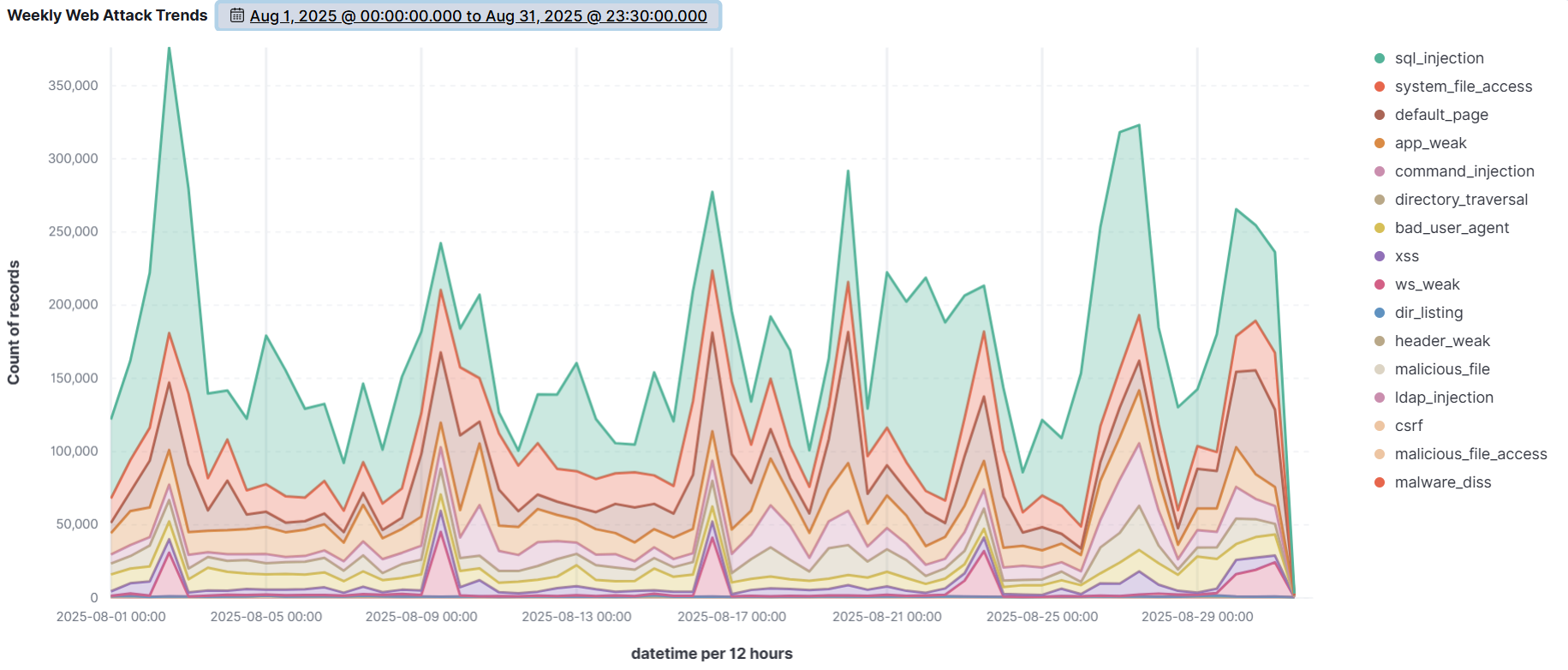 An analysis of the data detected by AIWAF during August 2025 revealed that an average of over 350,000 web attacks were detected per day.