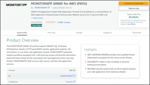 MONITORAPP's AIWAF-VE PAYG offers 1 month Free Trial service if you want to protect your web server with MONITORAPP's high-performance, high-spec, secure, fast-deployed, with undisrupted web firewall service in the form of a hybrid cloud. [1] http://www.it-sp.eu/index.php?option=com_content&view=article&id=3762&Itemid=102 [2] https://aws.amazon.com/marketplace [3] https://docs.aws.amazon.com/ko_kr/marketplace/latest/userguide/what-is-marketplace.html